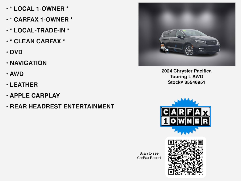 CARFAX VERIFIED 1-OWNER. Free CARFAX report! DESIRABLE FEATURES: * LOCAL 1-OWNER *, * CLEAN CARFAX *, * CARFAX 1-OWNER *, * LOCAL-TRADE-IN *, LEATHER, DVD, NAVIGATION, AWD, APPLE CARPLAY, 360 CAMERA, REAR HEADREST ENTERTAINMENT, HEATED-SEATS, PARK ASSIST, BLU-RAY PLAYER, ANDROID AUTO, LANE-DEPARTURE WARNING, HEATED-STEERING WHEEL, STOW "N" GO, 3RD ROW SEAT, HEATED-REAR SEATS, VOICE CONTROLS, HANDS-FREE LIFTGATE, MULTI-ZONE AC, BLIND-SPOT MONITORING, BLUETOOTH, REAR HEAT/AC, BACKUP CAMERA, POWER REAR LIFTGATE, BACKUP-SENSORS, FOG LAMPS, ALLOY-WHEELS, WiFi Hotspot, 2nd ROW CAPTAINS, usb, SiriusXM, Remote entry. Your 2024 Chrysler Pacifica Touring L AWD is perfect for daily work or weekend road trips to our neighboring communities of Lancaster, Columbus, Newark, Pickerington, and Logan.Hugh White Chevrolet of Lancaster also offers extended vehicle service contracts so our Lancaster, OH area drivers enjoy a worry-free used car, SUV or van ownership experience. We proudly serve the counties of Fairfield, Hocking, Perry, Licking, and Pickaway with quality pre-owned vehicles Ohio drivers can trust.