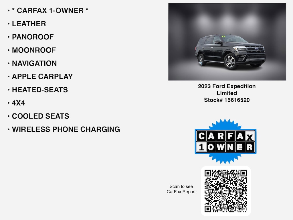 CARFAX VERIFIED 1-OWNER. Free CARFAX report! DESIRABLE FEATURES: * CARFAX 1-OWNER *, NAVIGATION, LEATHER, PANOROOF, MOONROOF, APPLE CARPLAY, ANDROID AUTO, COOLED SEATS, WIRELESS PHONE CHARGING, HEATED-SEATS, 4X4, REMOTE START, 3RD ROW SEAT, HEATED-STEERING WHEEL, B&O AUDIO, LANE-DEPARTURE WARNING, HEATED-REAR SEATS, TOW PKG, MULTI-ZONE AC, BACKUP CAMERA, REAR HEAT/AC, BLUETOOTH, VOICE CONTROLS, RUNNING-BOARDS, BLIND-SPOT MONITORING, HANDS-FREE LIFTGATE, POWER REAR LIFTGATE, BACKUP-SENSORS, FOG LAMPS, ALLOY-WHEELS, 2nd ROW CAPTAINS, Remote entry, SiriusXM, usb. Your 2023 Ford Expedition Limited is perfect for daily work or weekend road trips to our neighboring communities of Lancaster, Columbus, Newark, Pickerington, and Logan.Hugh White Chevrolet of Lancaster also offers extended vehicle service contracts so our Lancaster, OH area drivers enjoy a worry-free used car, SUV or van ownership experience. We proudly serve the counties of Fairfield, Hocking, Perry, Licking, and Pickaway with quality pre-owned vehicles Ohio drivers can trust.