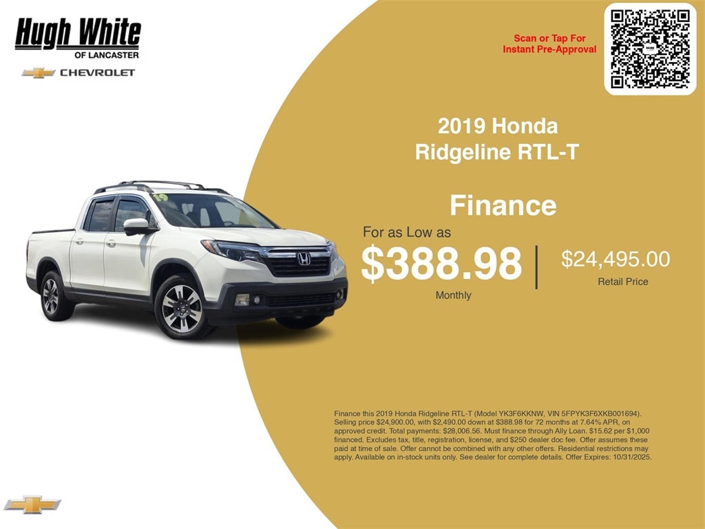 This and other GM finance offers leverage the benefits of GM Financial. Call or drive in for GM finance deals like this stunning 2019 Honda Ridgeline with finance options near Lancaster! This Ridgeline is also available for sale near Pickerington, Circleville, and Logan. These GM finance specials end 10/31/2025 Disclaimer: Finance this 2019 Honda Ridgeline RTL-T (Model YK3F6KKNW, VIN 5FPYK3F6XKB001694). Selling price $22,936.00, with $2,293.00 down at $357.83 for 72 months at 7.59% APR, on approved credit. Total payments: $25,763.76. Must finance through Ally Loan. $15.60 per $1,000 financed. Excludes tax, title, registration, license, and $250 dealer doc fee. Offer assumes these paid at time of sale. Offer cannot be combined with any other offers. Residential restrictions may apply. Available on in-stock units only. See dealer for complete details. Offer Expires: 10/31/2025.