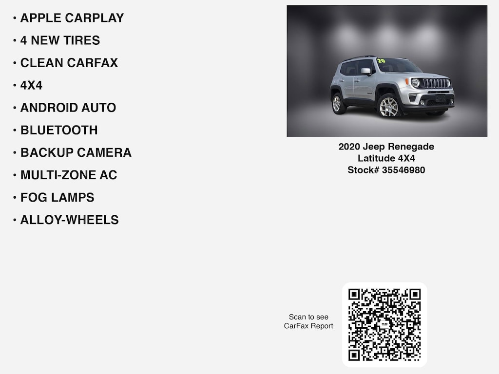 Free CARFAX report! DESIRABLE FEATURES: APPLE CARPLAY, 4 NEW TIRES, CLEAN CARFAX, 4X4, ANDROID AUTO, BACKUP CAMERA, BLUETOOTH, MULTI-ZONE AC, FOG LAMPS, ALLOY-WHEELS, Remote entry, SiriusXM. Your 2020 Jeep Renegade Latitude 4X4 is perfect for daily work or weekend road trips to our neighboring communities of Lancaster, Columbus, Newark, Pickerington, and Logan.Hugh White Chevrolet of Lancaster also offers extended vehicle service contracts so our Lancaster, OH area drivers enjoy a worry-free used car, SUV or van ownership experience. We proudly serve the counties of Fairfield, Hocking, Perry, Licking, and Pickaway with quality pre-owned vehicles Ohio drivers can trust.