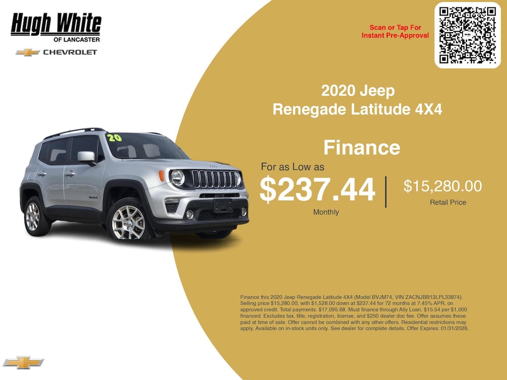 This and other GM finance offers leverage the benefits of GM Financial. Call or drive in for GM finance deals like this stunning 2020 Jeep Renegade with finance options near Lancaster! This Renegade is also available for sale near Pickerington, Circleville, and Logan. These GM finance specials end 1/31/2026 Disclaimer: Finance this 2020 Jeep Renegade Latitude 4X4 (Model BVJM74, VIN ZACNJBB13LPL33874). Selling price $15,280.00, with $1,528.00 down at $237.44 for 72 months at 7.45% APR, on approved credit. Total payments: $17,095.68. Must finance through Ally Loan. $15.54 per $1,000 financed. Excludes tax, title, registration, license, and $250 dealer doc fee. Offer assumes these paid at time of sale. Offer cannot be combined with any other offers. Residential restrictions may apply. Available on in-stock units only. See dealer for complete details. Offer Expires: 01/31/2026.
