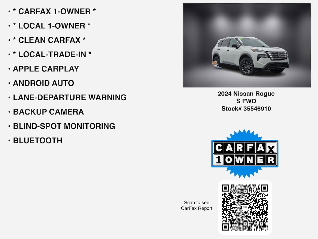 CARFAX VERIFIED 1-OWNER. Free CARFAX report! DESIRABLE FEATURES: * CLEAN CARFAX *, * LOCAL 1-OWNER *, * CARFAX 1-OWNER *, * LOCAL-TRADE-IN *, APPLE CARPLAY, ANDROID AUTO, LANE-DEPARTURE WARNING, BACKUP CAMERA, BLIND-SPOT MONITORING, BLUETOOTH, ALLOY-WHEELS, BACKUP-SENSORS, Remote entry, SiriusXM. Your 2024 Nissan Rogue S FWD is perfect for daily work or weekend road trips to our neighboring communities of Lancaster, Columbus, Newark, Pickerington, and Logan.Hugh White Chevrolet of Lancaster also offers extended vehicle service contracts so our Lancaster, OH area drivers enjoy a worry-free used car, SUV or van ownership experience. We proudly serve the counties of Fairfield, Hocking, Perry, Licking, and Pickaway with quality pre-owned vehicles Ohio drivers can trust.